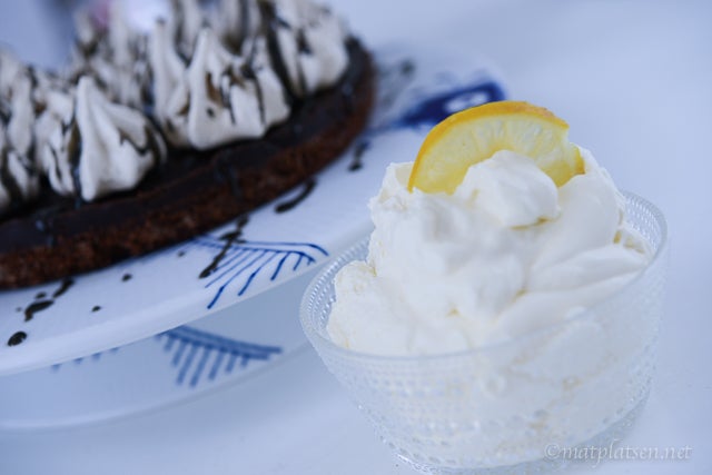 Toppa med maränger och koka upp lakritssåsen (grädde + kick) och ringla över. Servera med citrongrädde eller hallongrädde, smakar gott i hop med lakrits!