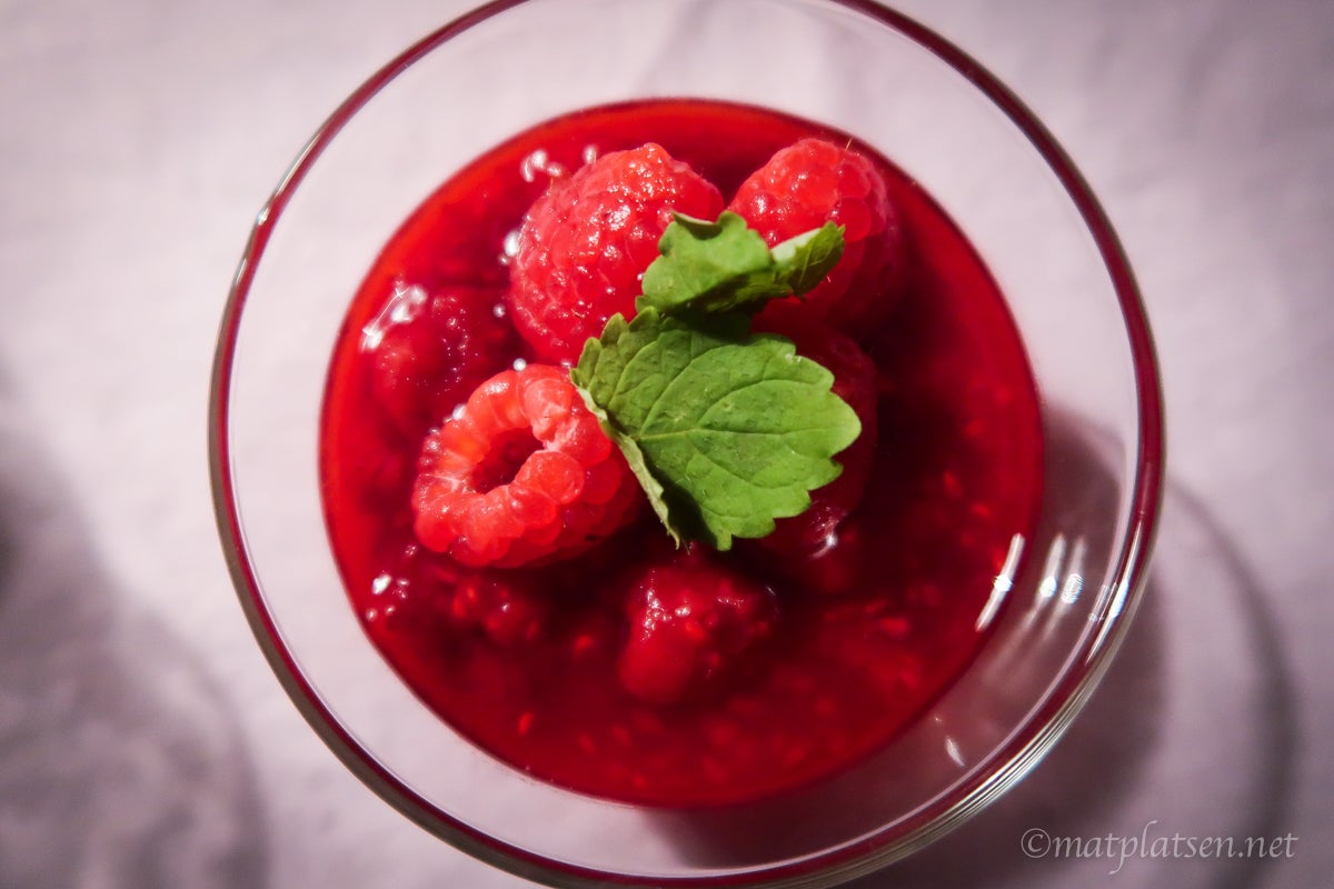 Toppa pannacottan med hallonkompotten precis innan servering. Dekorera med färska hallon och citronmeliss.