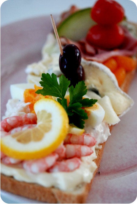 Middag blev landgångar som precis slunkit ner framför tv:n. Mums!!! På min hade jag majonnäs, färska räkor, citron, ägg, parmesan/räk-röra, olia dessertostar, sallad, oliver, skinka, gurkmajonnäs, melon, konserverade mandariner och körsbärsplommontomater. Gott även för ögat!