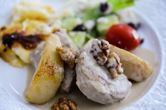 Fläskfilé i ädelostsås med stekta päron och valnötter, recept