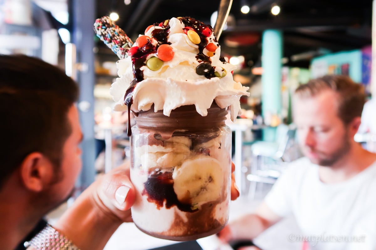 Mysigt ”hak” med retrokänsla och en meny där jag ville äta typ allt. Lite synd att jag inte orkade prova deras ”springrolls” (cheeseburgare som vårrullar). Beställde en ”Den Fule” (minus svampen, plus extra cheddarost), discofries, diverse dippsåser och ”instagramvänligt serverad bananasplit”.