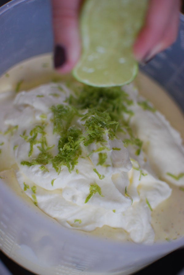 Glass: Dela vaniljstången på längden och skrapa ur fröna. Vispa äggulorna med vaniljfrön och florsocker vitt och luftigt. Vispa grädden. Vänd ner äggvispet, rivet skal och saft av lime i grädden.