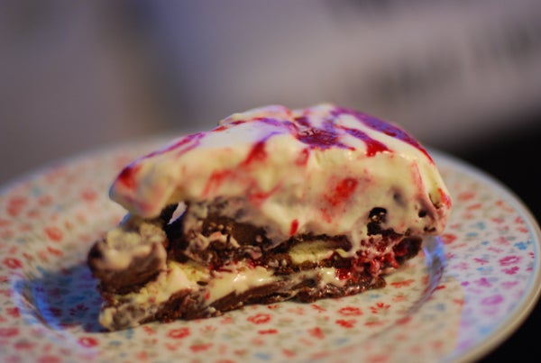 Lossa browniebottnen från formen och dela den till 2 bottnar. Lägg tillbaka den ena bottnen i formen. Häll i hälften av glassmeten och ”rippla” med snabba rörelser i hälften av hallonmixet med en tesked. Lägg på den andra bottnen, häll på resten av glassmeten. Rippla på resten av hallonmixet i ett vackert mönster. Frys i minst 8 timmar, gärna över natten.