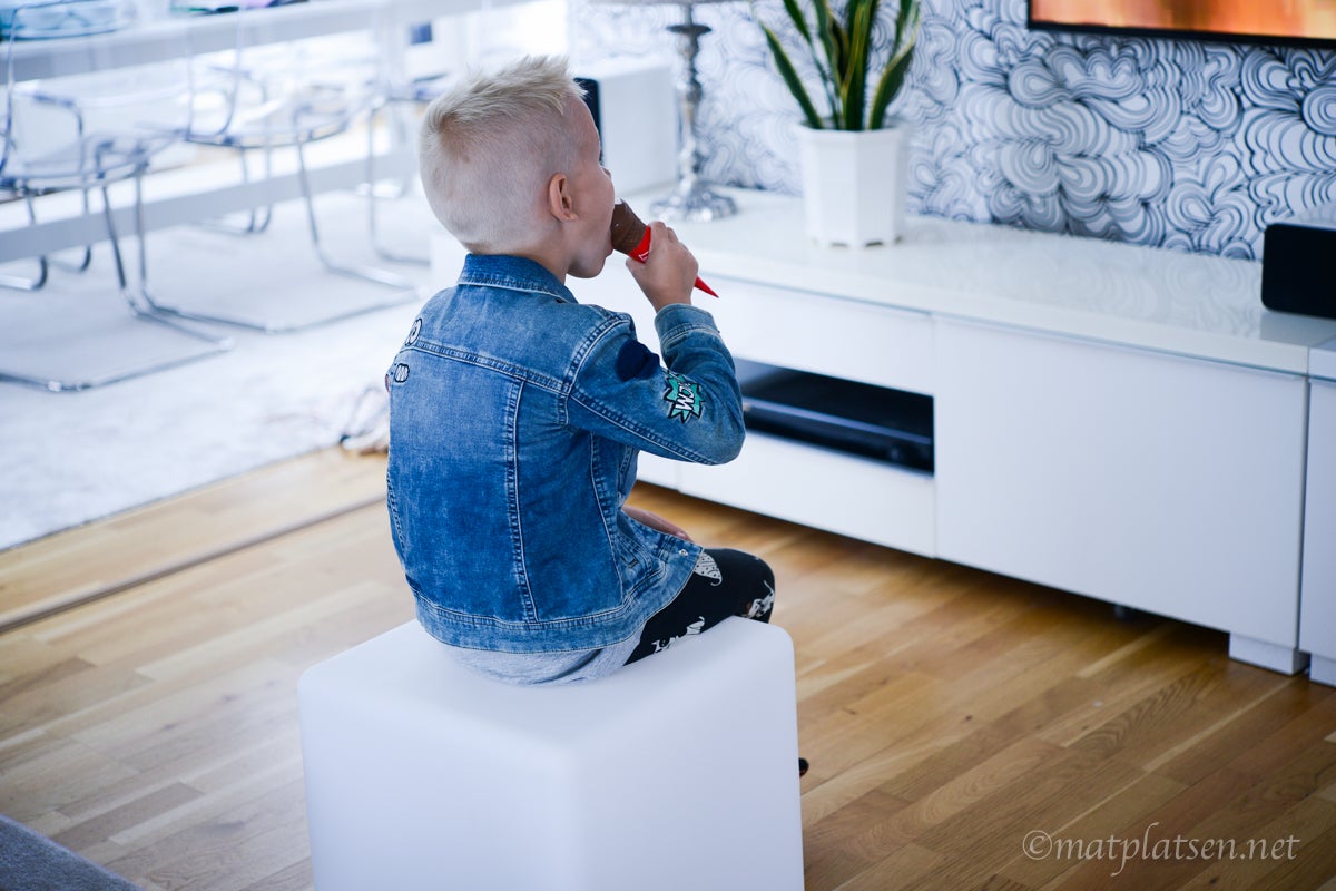 Han sitter på senaste tillskottet till takterassen, en kub som lyser i olika färger (man väljer med fjärrkontroll) och kan användas som pall eller bord. Matchar bollarna i samma serie som vi fick av mamma och pappa i invigningspresent, kommer bli såå fint. Finns HÄR (adlink). Även bardisken går att tända upp, visar ordentligt när den är komplett (ena delen var skev nämligen, har äntligen fått en ny men måste ha hit en maskin att lyfta upp den med..) Jag köpte en ramlösa i ny (?) smak som var riktigt riktigt god (jag är kräsen vad gäller smaksatt vatten) och en zebraklänning på H&M som satt väldigt fint.     Nu ska jag göra ett ryck och städa medan barnen städar sina rum (inget städat rum på fredagsmorgon = ingen veckopeng) och förbereda kvällens middag. KRAM