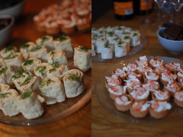 Till detta serverade Jossan 2 olika snittar. Crustader med skaldjursfyllning (skaldjursröra och kräftstjärtar) och tunnbrödsrullar med aioli och stenbitsrom och ovanpå en liten färsk dilvippa. Tunnbrödssnittarna var såååå goda. Enkelt men jättegott! Så det ska jag lägga på minnet.