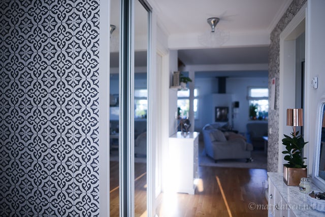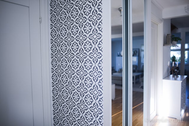 Vi har gjort en liten makeover i hallen. Hade en så tråkig vit vägg där vi samlar posten (och samlar allt möjligt skräp, alltid överfull). Och jag som äääälskar marockanskt kakel men inte har det någonstans (hade vi byggt huset efter den trenden kom hade jag absolut lagt det i något av badrummen) blev så kär i denna tapet så jag beställde en rulle som vi satte upp på ett kick. (Sån där tapet man penslar limmet på väggen och sen trycker dit tapeten ni vet, bästa!)