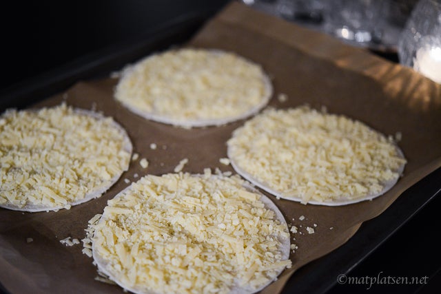 Sprid ut ett jämt lager ost över varje tortilla och baka i ugn 200 C i ca 5-10 minuter, tills osten smält och pizzorna fått lite färg.