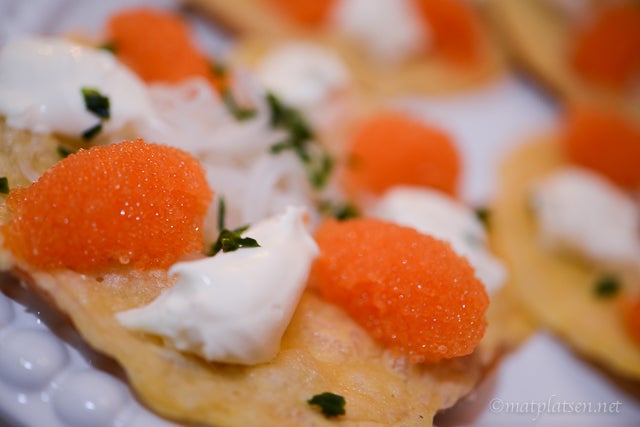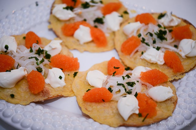 Lägg på snygga klickar med löjrom och smetana på pizzorna, samt små högar med lök. Avsluta med att strö över finhackad gräslök.