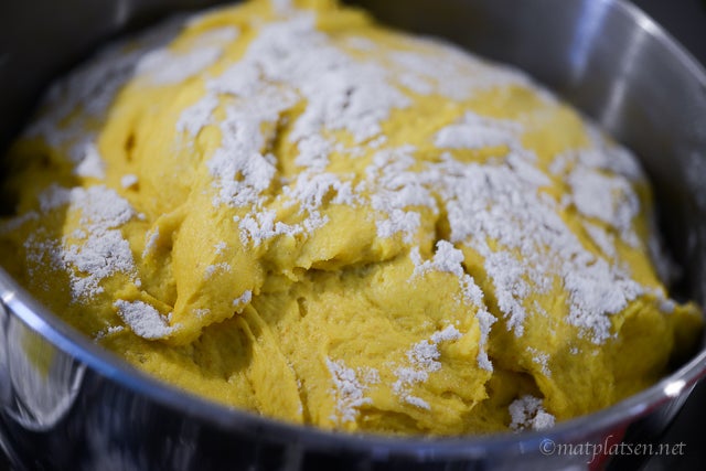 Ta upp degen på mjölat bakbord och knåda rund. Täck med plast och låt vila i cirka 30 minuter.