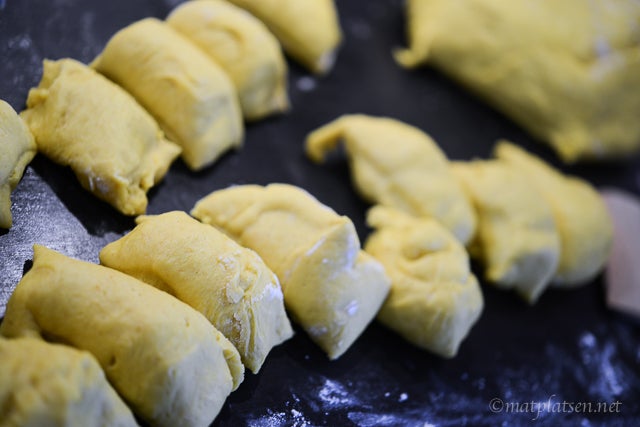 Gjorde sockrade bullar av halva degen och skurna lussekatter med pärlsocker av andra halvan.
