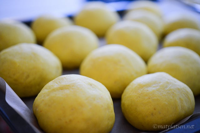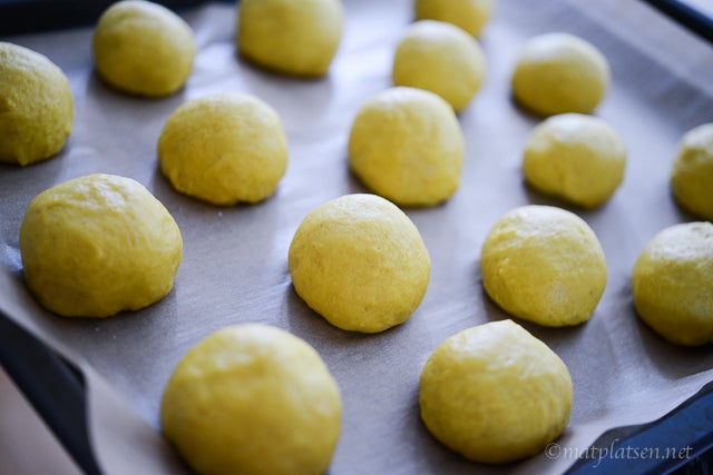 Dela degen i små bitar (35-40 stycken). Rulla dem och sätt på plåt med papper. Täck med bakduk eller plast. Låt jäsa 1,5-2 timmar.