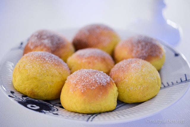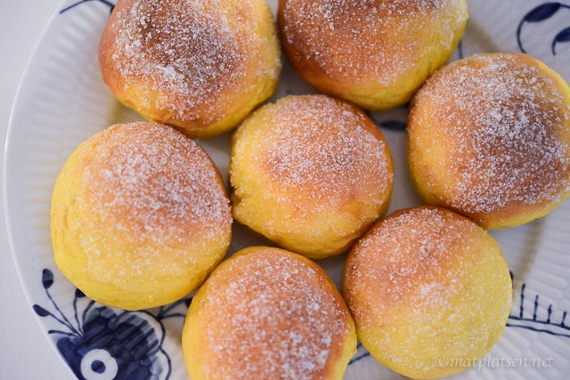Grädda bullarna i ugn på 240 grader cirka 7 minuter eller tills de har fått en fin gyllene färg. Pensla bullarna med smält smör och vänd dem i socker.