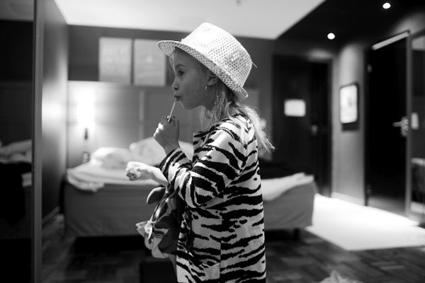 Tok-laddad Oliv som fick följa med mig som stand-in på Melodifestivalen sist och här testar presenter i form av läppglans från Face och rygga från Skip Hop/Amvina som väntade på rummet, så uppskattat, *tack*