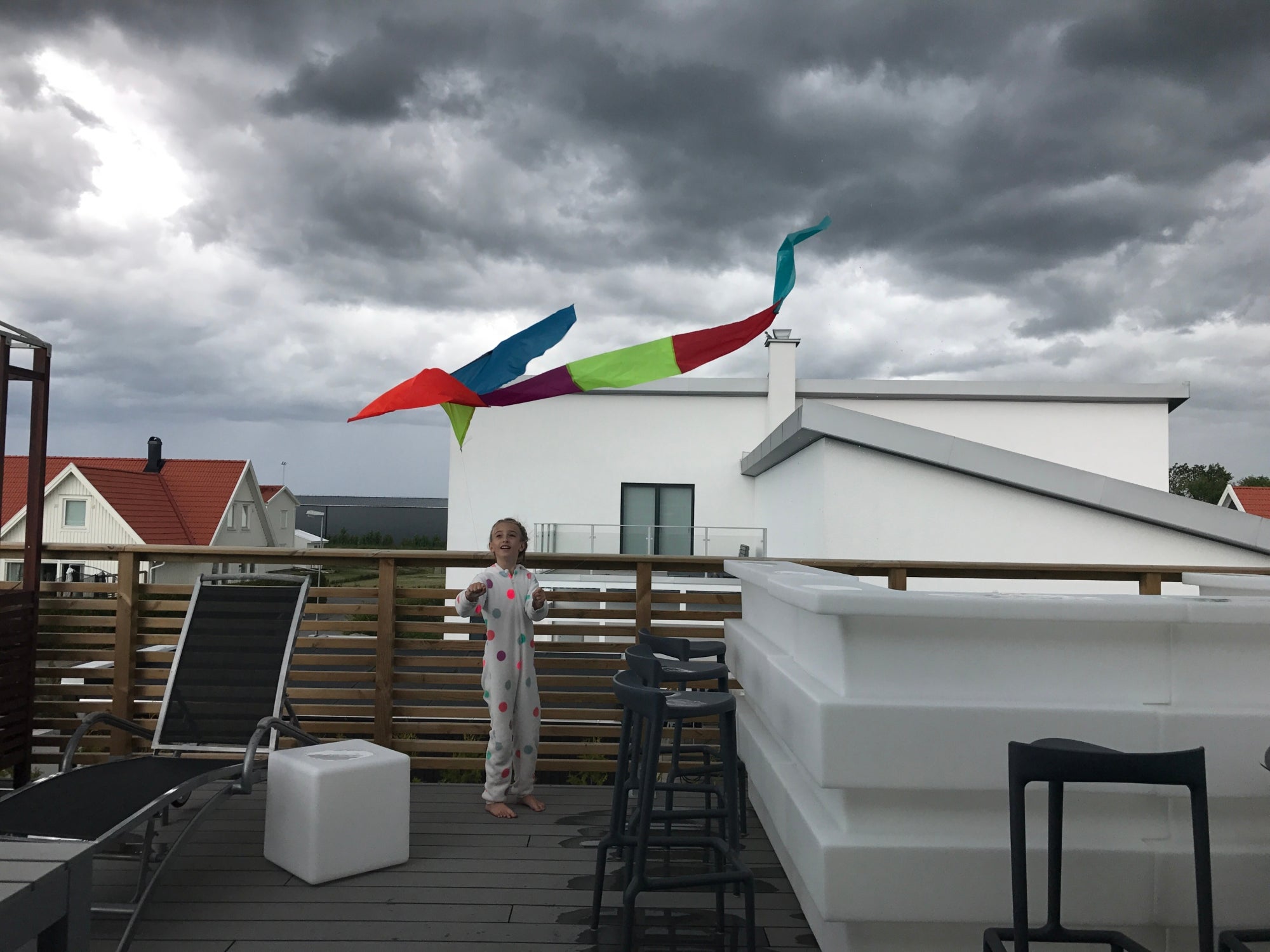 Olivia har vi inte sett mycket av i dag. Ugglat på rummet som en tvättäkta tonåring. Kom plötsligt ut och svingade sin nya drake medan det blåste halv storm. (Present från i går når hon och E hade gemensamt kalas för tjejerna i klassen på Jump)