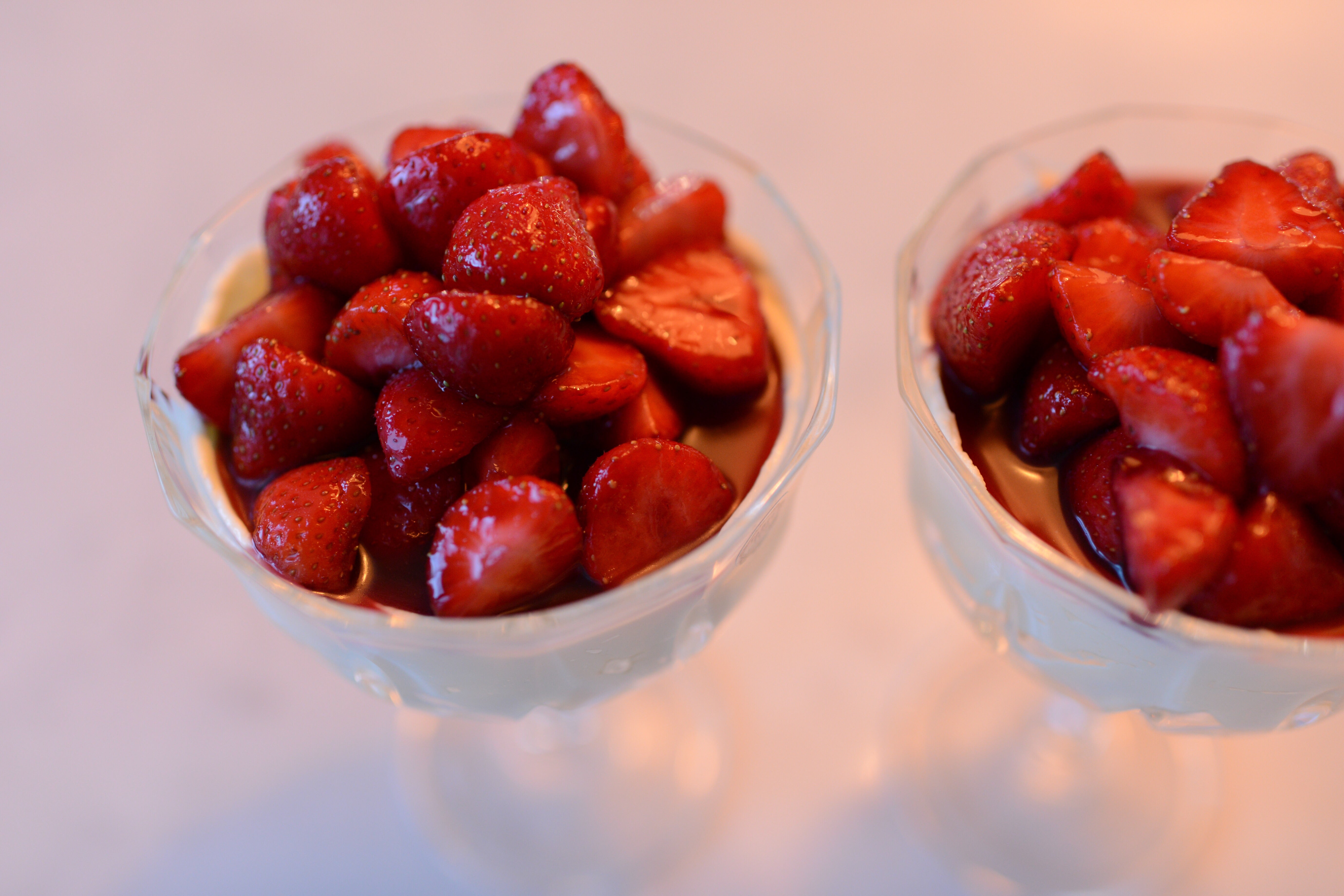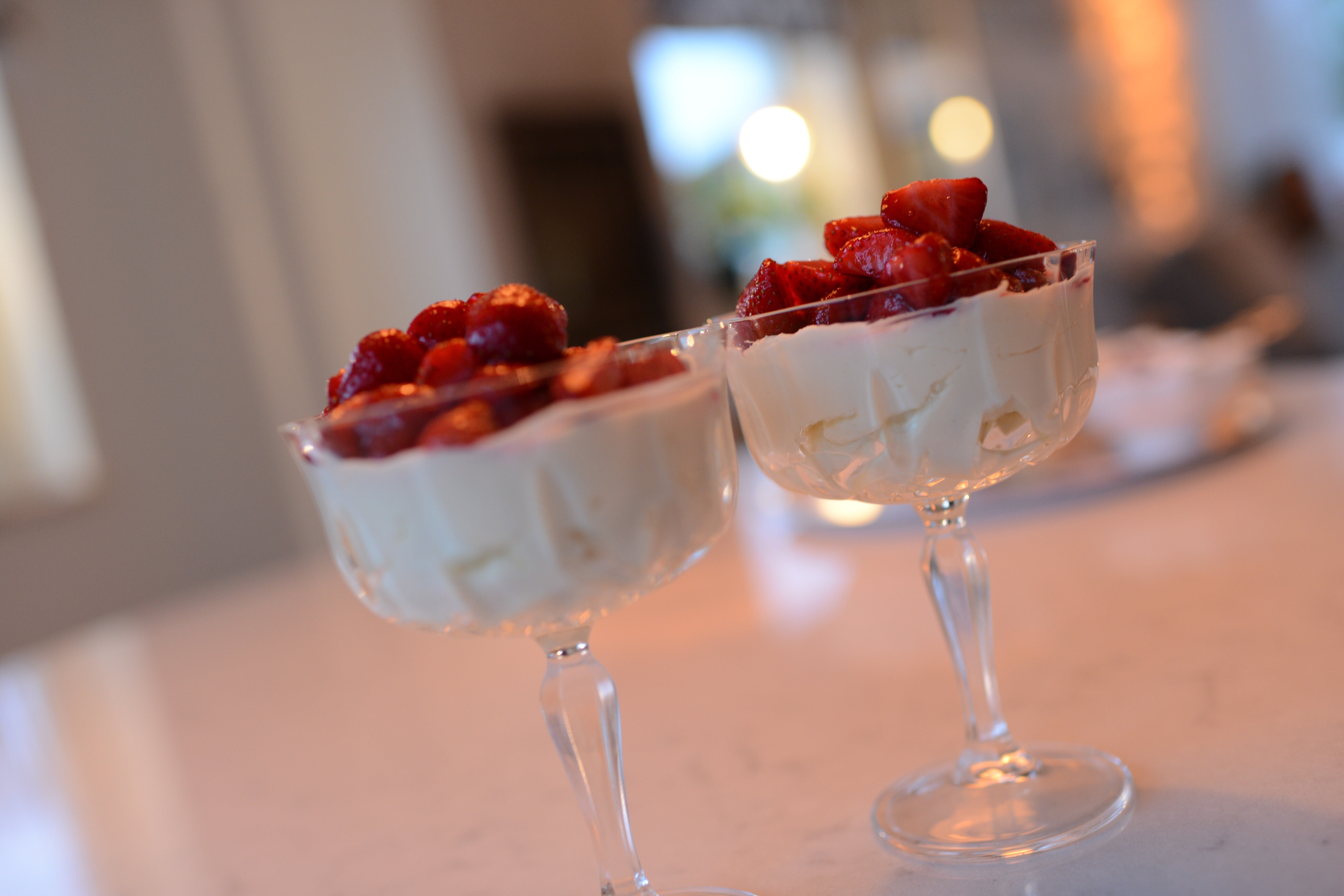 Häll upp krämen i fina glas på fot och lägg de vinmarinerade jordgubbarna över. Njut!
