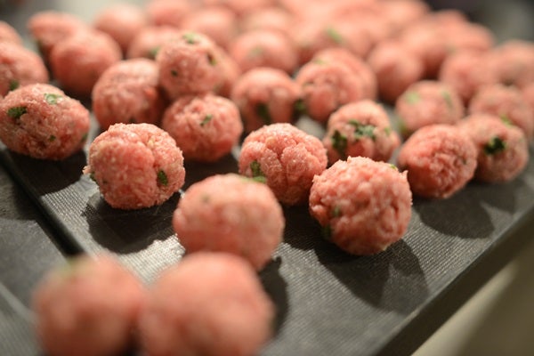 Blanda färsen med hackad persilja, pressad vitlök, grädde, salt & peppar. Rulla till fina små köttbullar.