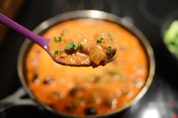 Hacka löken. Bryn köttbullarna så de får fin färg runtom. Lägg i löken och låt fräsa med en stund. Häll över de krossade tomaterna och grädden och låt småputtra i 15 minuter Tillsätt oliverna och låt dem bli genomvarma.