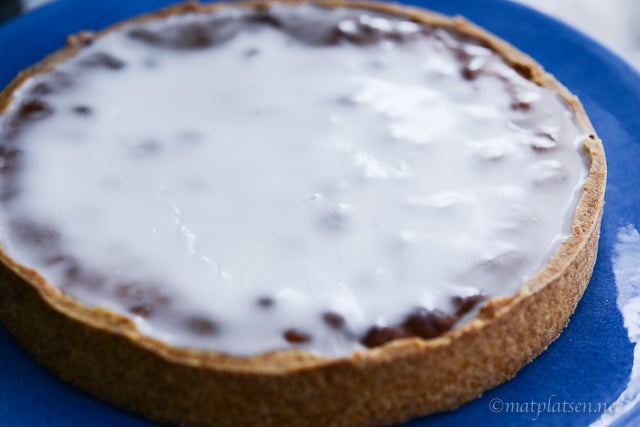 Kör vetemjöl, socker, matfett och äggula till en deg i en matberedare.Tryck ut degen i en smord form, 23 cm i diam, med löstagbar kant. Tryck upp degen en bit på kanten, ca 3–4 cm. Ställ formen kallt i 30 min.