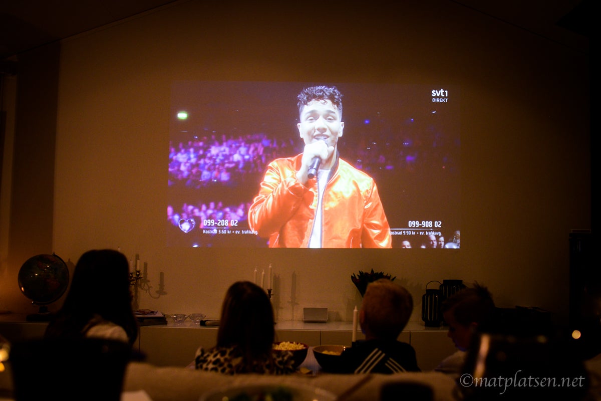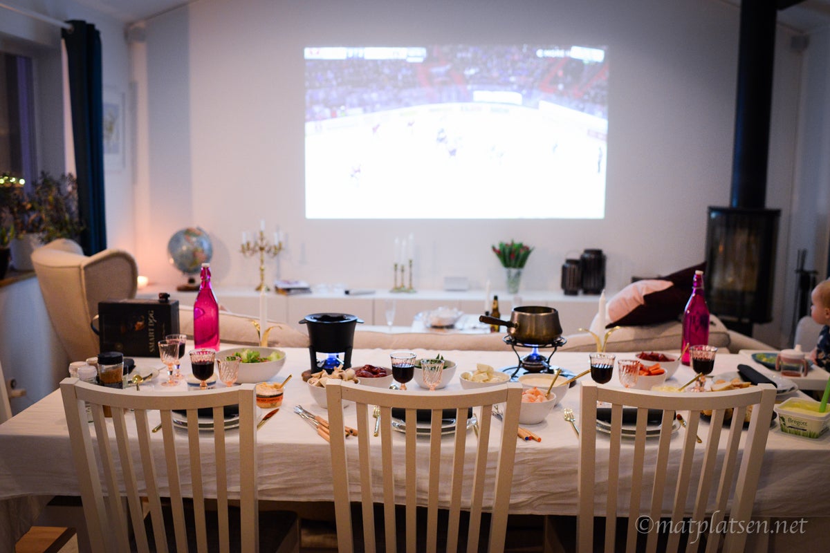 Det var uppdukat för fondue (sååå himla gott) framför storbilds-TVn och familjen Riis höll sig vakna otippat länge med tanke på att mina ögon knappt syntes för jag var så trött (gick upp 03.40). Undantag för S som somnade i soffan. Hejade på Felix, ny chans på lördag.