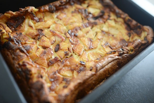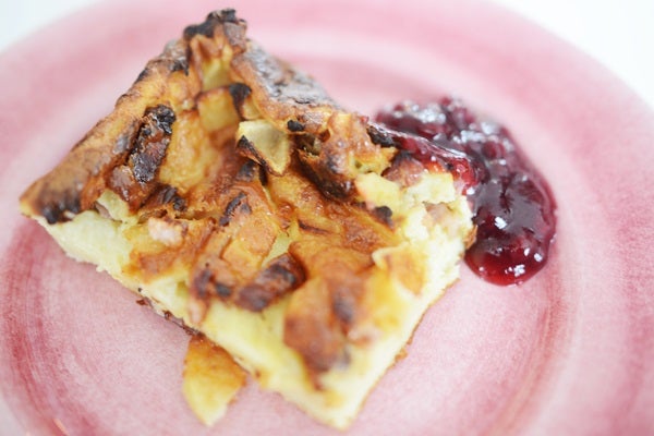 Sätt ugnen på 225 C. Strimla fläsket och bryn det i stekpanna. Kärna ur och skiva äpple. Vispa i hop övriga ingredienser till en slät smet. Smörj en ugnsfast form eller långpanna. Strö ut fläsk i botten och lägg över äppleskivorna. Häll sedan smeten över. Grädda nederst i ugnen ca 35 min. Lägg folie över om den börjar få för mycket färg.