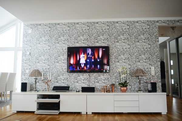 Jag undrar var din tapet kommer ifrån? Den är supersnygg! (Den vid tv:n)