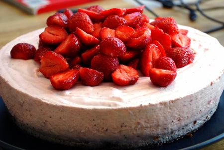 Häll smeten över bottnen. Ställ minst 4 timmar i kylskåp eller i frysen. (Tina isåfall 4 timmar i rumstemperatur vid serveringen). Toppa tårtan med 1 liter rensade jordgubbar.