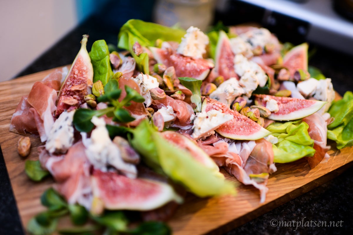 Till förrätt blev det två olika fat, det ena med parma, fikon, sallad, roquefortost och pistagenötter, det andra med machesallad, bresaola, solrosfrön och blodapelsin. Fräscht och gott!