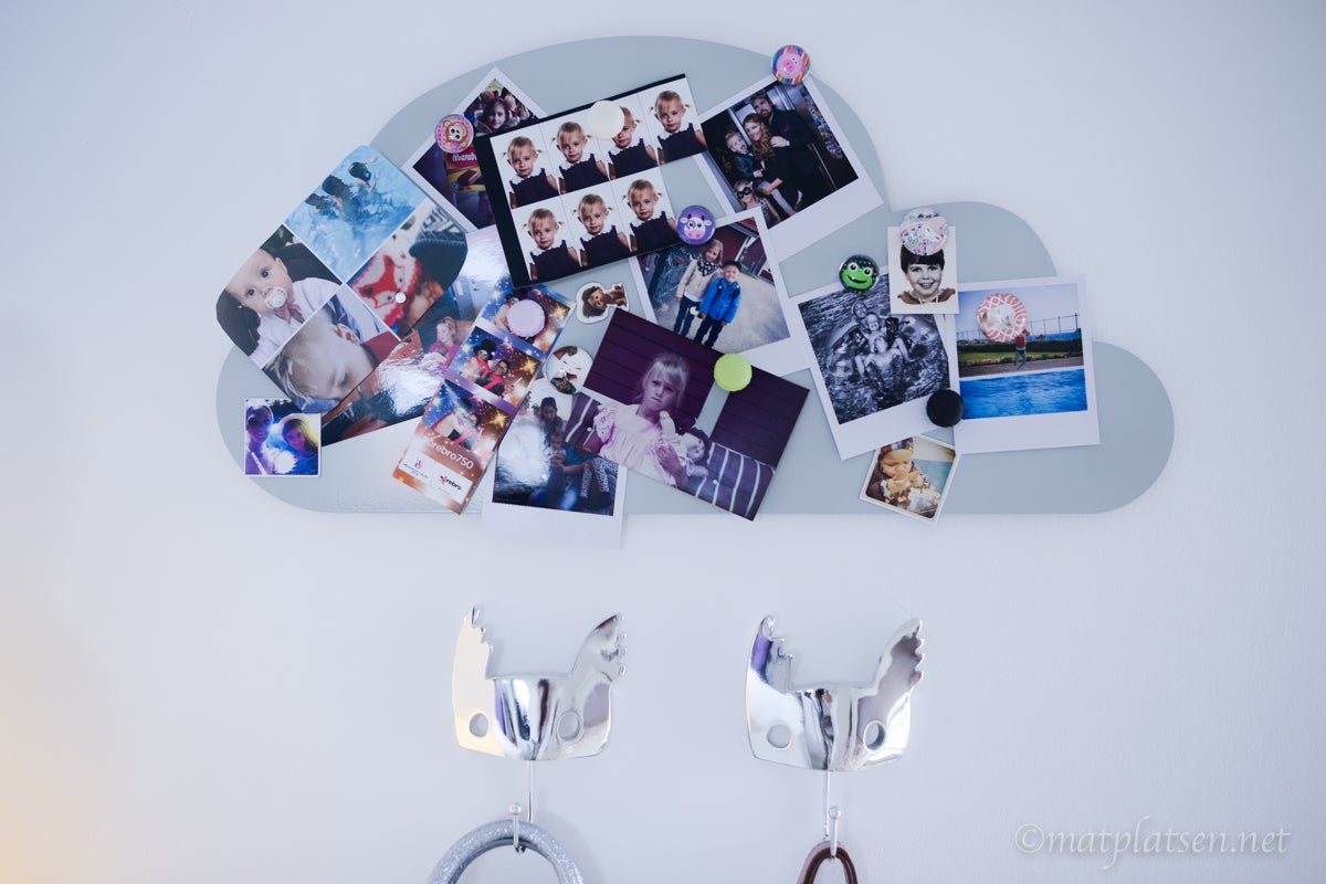 Städat så när som på överkasten som är i tvätten (efter att någon kort blond i familjen målat med tusch på) En vit hylla ska upp över molnet att ställa böcker på men annars så är det klart. Hon har mycket förvaring i två stora lådor under sängen, dubbla skrivbordshurtsar och en inbyggd garderob i väggen (som inte kom med på bild här)