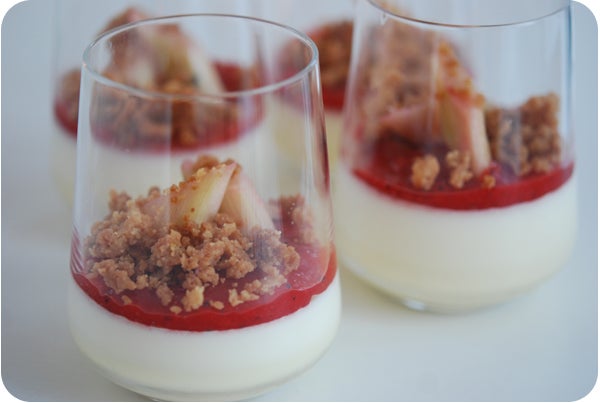 Ännu mer jordgubbar blev det i den goda desserten (recept ur Alltommat). I botten en fluffig vaniljmousse toppad med jorgubbs – och rabarberkräm med citron & vaniljkokt rabarber och vaniljcrumble.