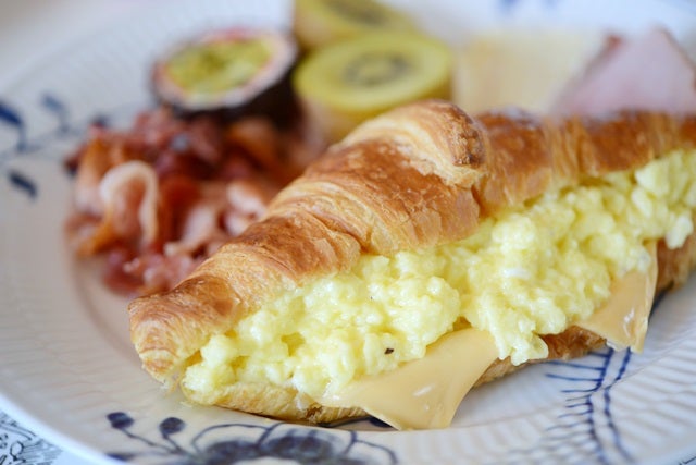 Fylld med mjukost (särskilt gott med skinkost), några skivor ost och äggröra – godaste som finns! Testa!!