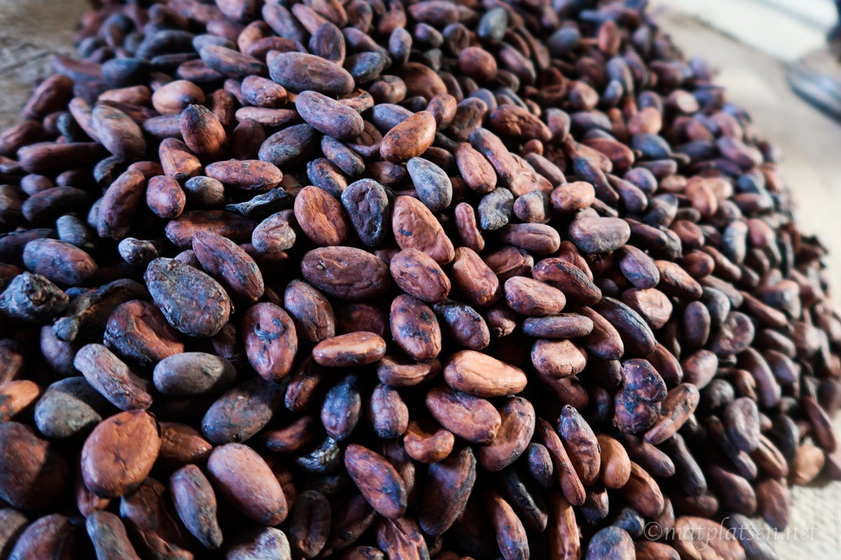 Hade aldrig sett en kakaofrukt tidigare men nu vet jag både hur de ser ut, hur man öppnar dem och hur man gör för att torka och producera kakaobönorna som sedan säljs och används till choklad mm. De färska kakaobönorna är täckta av ett lite slemmigt vitt hölje som smakar som en blanding mellan litchi och mango. Man lägger dem sen mellan blad att torka på marken så detta försvinner och själva bönorna lägger man sedan på stora bambumattor att torka och rostas i solen.