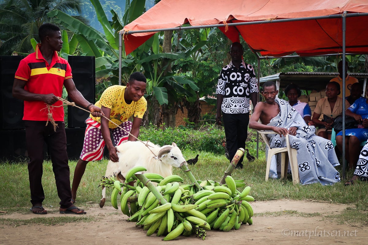 De byar vi besökte var alla delaktiga i Cocoa Plan och  glada och stolta att få vara en del av detta och berättade om hur mycket det förbättrat livet för dem. I en by fick vi (efter en lång hälsningscermoni som påminner om något man bara ser på film, så häftigt!) gåvor av hövdingen som tack i form av stora bananklasar och en GET (!).