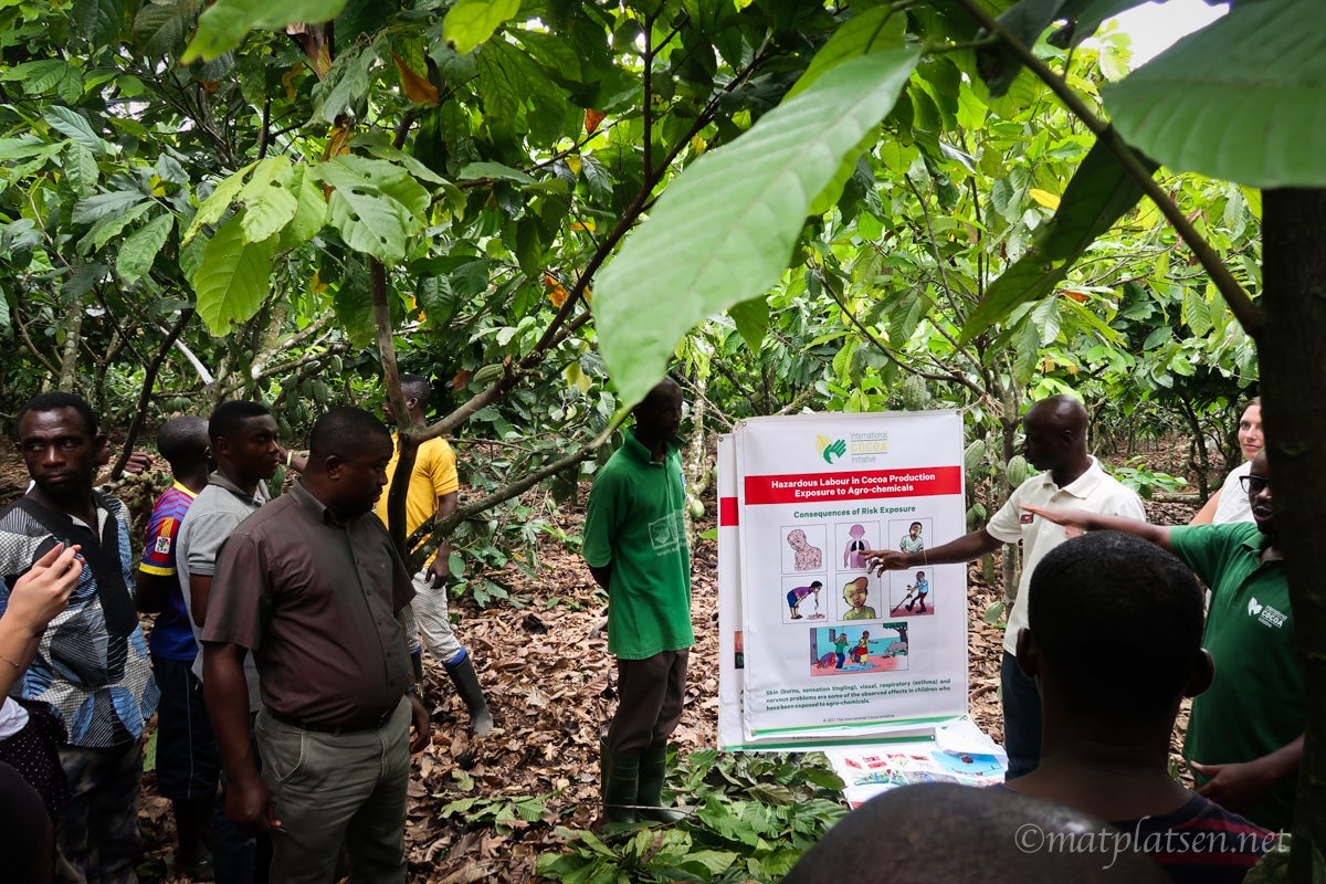 Att bara skänka pengar rakt upp och ner är inte en hållbar lösning, utan Cocoa Plan satsar på att lära odlarna att själva utvecklas och påverka sin egen situation. Tex så förser de dem med nya kakaoplantor, erbjuder fri business school (vi fick besöka en sådan klass, där satt vi under kakaoträden med byns invånare medan de jobbade med olika uppgifter och räkneexempel om hur investeringar i kakoplantorna (bekämpningsmdel etc) i slutändan ger en större vinst och det var så himla häftigt att se. De brann verkligen för att lära sig!) Det ges även utbildning i säkerhet och teknik. Vikten av rätt hantering av farligt material och hur man pollinerar kakaoträd att producera fler kakaofrukter. Allt detta fick vi vara med och se.