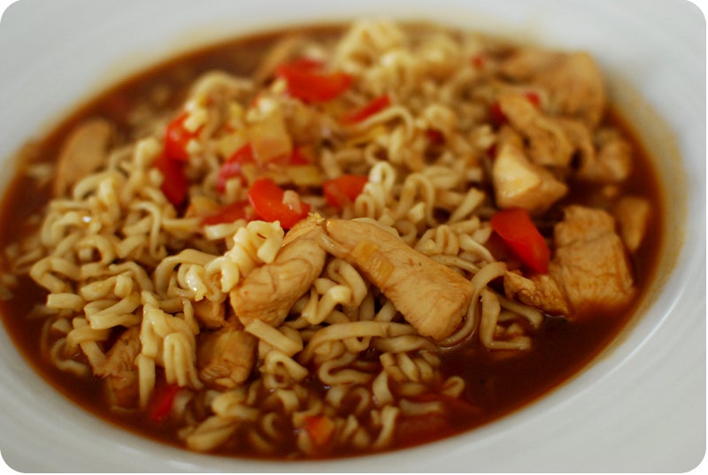 och peppra, lägg över i grytan. Häll på buljong och tillsätt chilisås och soja. Sjud ett par minuter. Lägg i nudlarna och låt koka ihop. Tillsätt eventuellt mer vätska. Smaka vid behov av med mer kryddor.