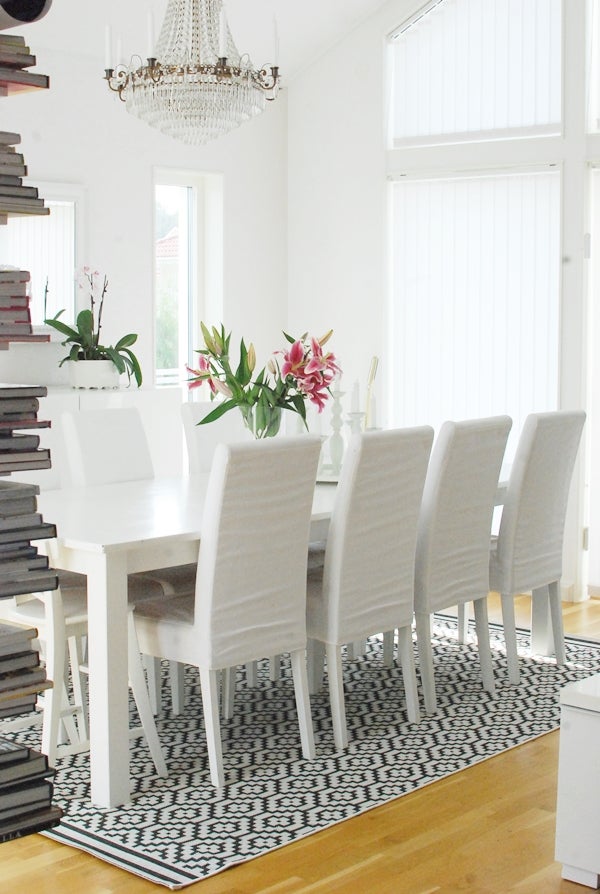 (Och bord och stolar kommer från MIO, var från början i ek men dem har vi målat vita. Stolsöverdragen är även de från MIO. Och barnens stolar IKEA. Så nu vet ni det :))