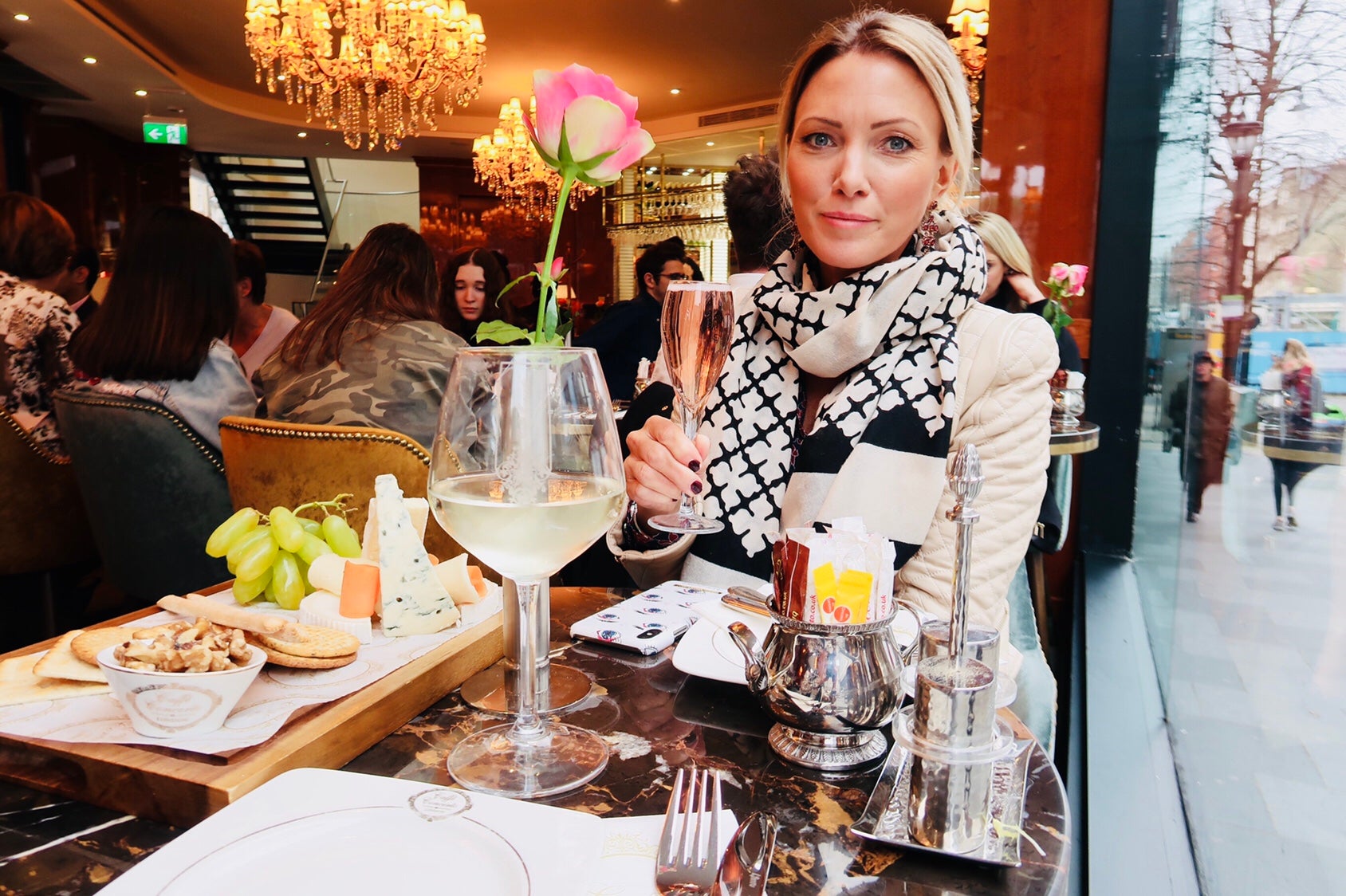 Vi sitter på Caffé Concerto och provar lite ostar. Ganska tråkiga ostar tyvärr men kul upplagt. Många härliga bakverk här och verkar poppis för en lite finare fikapaus. Rosa bubblor och macarons här och var.