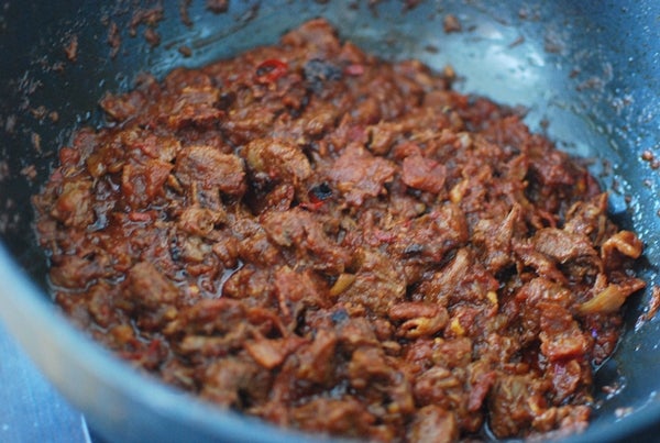 Bryn köttbitarna i omgångar i lite av baconfettet samt lite olivolja. Fiska upp köttet. Fräs lökhack i några minuter under omrörning. Tillsätt jalapeño och vitlök och fräs ytterligare ett par minuter. Ös ner chili- och kryddblandningen och fräs i ett par minuter.