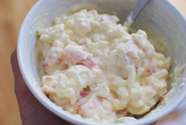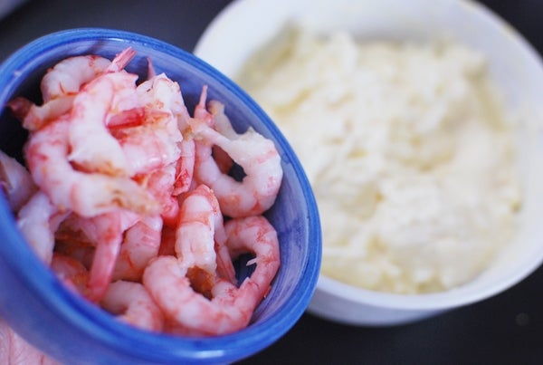 Koka ägg (ca 1 1/2 per macka) och låt svalna. Hacka i små tärningar och blanda med en god majonnäs. Smaka av med salt. Tillsätt skalade räkor. (Mängd majjo och räkor tar ni som ni tycker men den ska vara ganska geggig röran så snåla inte!)