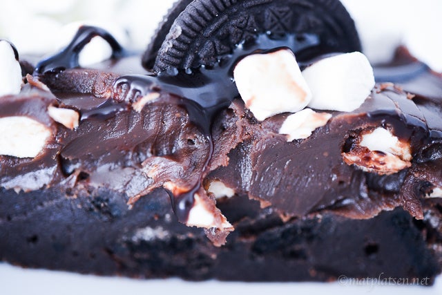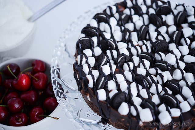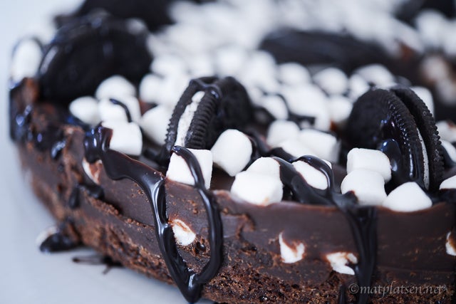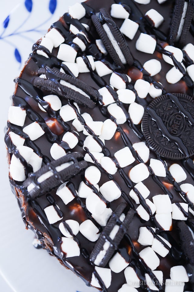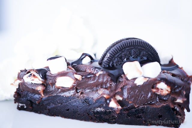 Finhacka chokladen till fyllningen, värm grädde i en kastrull och rör ner chokladen. Klicka i smör och rör till en jämn smet, låt svalna lite. Lägg minimarshmallows på den gräddade kakan, spara några till topping. Häll över fudgesmeten och häll på resterande marshmallows, tryck ner minioreokakor lite varstans (eller halverade stora oreos), ringla över chokladsås. Låt kakan svalna och stelna i kylen minst 2 timmar.