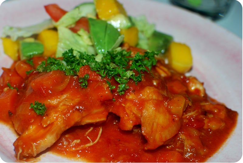 Det blev en gryta Osso bucco på kycklinglårfilé här. Gott och mustigt. Servera med ris eller bara en bit gott nybakat bröd att doppa i den smakrika tomatsåsen. Kycklingen blir så mör så den nästan rasar samman!