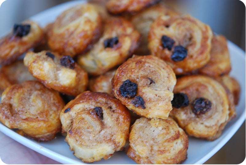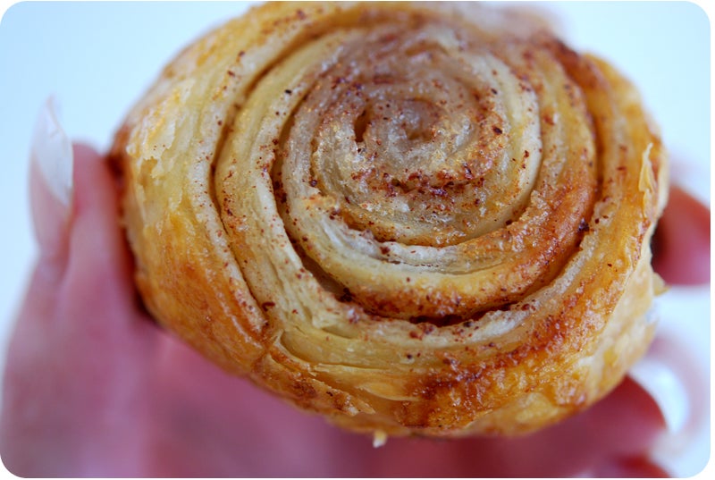Blanda smör+kanel+socker efter smak och bred på smördegsarket (precis som när man gör bullar). Strö ev på russin om man gillar det. Rulla i hop som en rulltårta och skär ca 1 cm tjocka skivor. Lägg på bakplåtspappersklädd plåt och pensla med ägg. Vill man ha pärlsocker på strör man på det och sen in i ugnen, 225 C ca 10 min (tills de fått fin färg). Servera genast, godast alldeles nybakade.