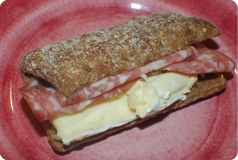 En av mina favoritmackor. Grovt bröd (här Pågens rågklämmor, god mättande nyhet!) med salami och brieost. Så enkelt så gott!!!!