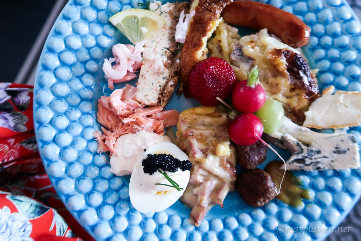 Påskbuffen innehöll ägg, sill, varmrökt lax med romsås, gravad lax och hovmästarsås, köttbullar, prinskorv, omelett med skinkstuvning, jansons frestelse, min skagencheesecake, västerbottenpaj och ostbricka.