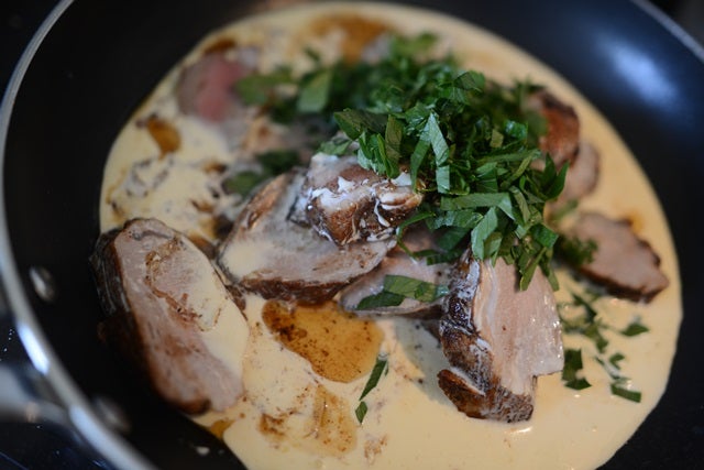 Salta och peppra köttet och stek runt om i smör i en het panna. Sänk värmen och stek sedan tills köttet är genomstekt (kolla med termometer!). Lägg köttet åt sidan och vila inslaget i folie en stund. Lägg i vitlöksosten i stekskyn och låt smälta. Tillsätt grädde och soja. Skiva köttet och lägg i det och tillsist hackad bladpersilja. Låt puttra en stund och smaka av med salt och peppar.