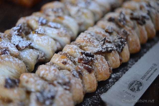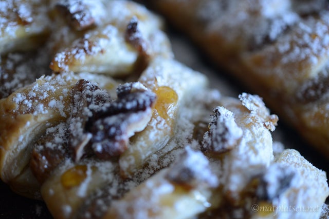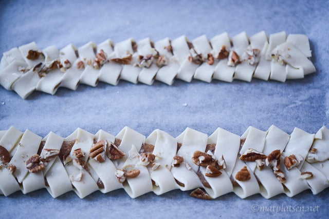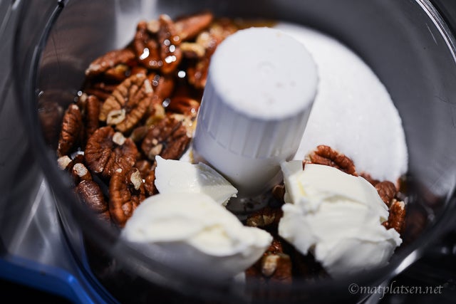 Rosta pekannötterna till fyllningen i ugnen i ca 10 min i 180 grader, låt svalna. Sätt ugnen på 220 grader. Mixa alla ingredienser till fyllningen i en matberedare. Dela smördegen i två längder. Klipp sidorna lite snett. Bred fyllningen i mitten, ca 2 msk per längd. Fläta så de täcker fyllningen. Pensla med lite vatten och strö över hackade pekannötter (dessa ska inte vara rostade) Grädda i ugnen i ca 15-18 minuter. Låt svalna och ringla över lite lönnsirap och pudra över florsocker innan servering.