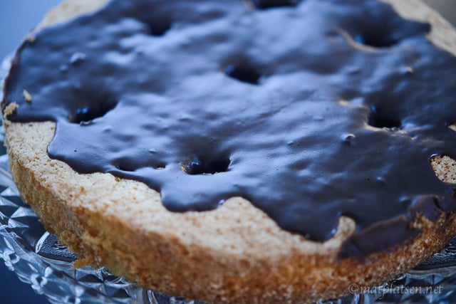 Blanda ihop ingredienserna till glasyren i en kastrull. Koka krämen under omrörning tills den tjocknat något, ca 10 minuter. Gör sju hål med tex en tesked i den varma kakan. Hålen ska vara ca 2 cm i diameter. Häll över den varma glasyren så hålen fylls, resten hälls över kakan. Ställ kakan i kylen så den kallnar ordentligt och glasyren stelnar. Servera med vispad grädde till. Nomnom!