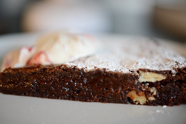 Smält smöret och låt svalna. Vispa ihop ägg och socker försiktigt, blanda de torra ingredienserna och rör ner dem i smeten. Vispa ner smöret. Hacka valnötterna grovt och rör ner dem. Häll smeten i en smord form med bakpapper i botten. Grädda i 160 C ca 15-25 min (så olika på olika ugnar, ta ut den när den fortfarande är rejält kladdig men börjar sätta sig i kanterna en bit in). Ställ kallt att svalna. Pudra över florsocker innan servering (gärna med juligt mönster, jag la en urklippt julgran av kartong ovanpå kakan innan jag siktade över florsockret)