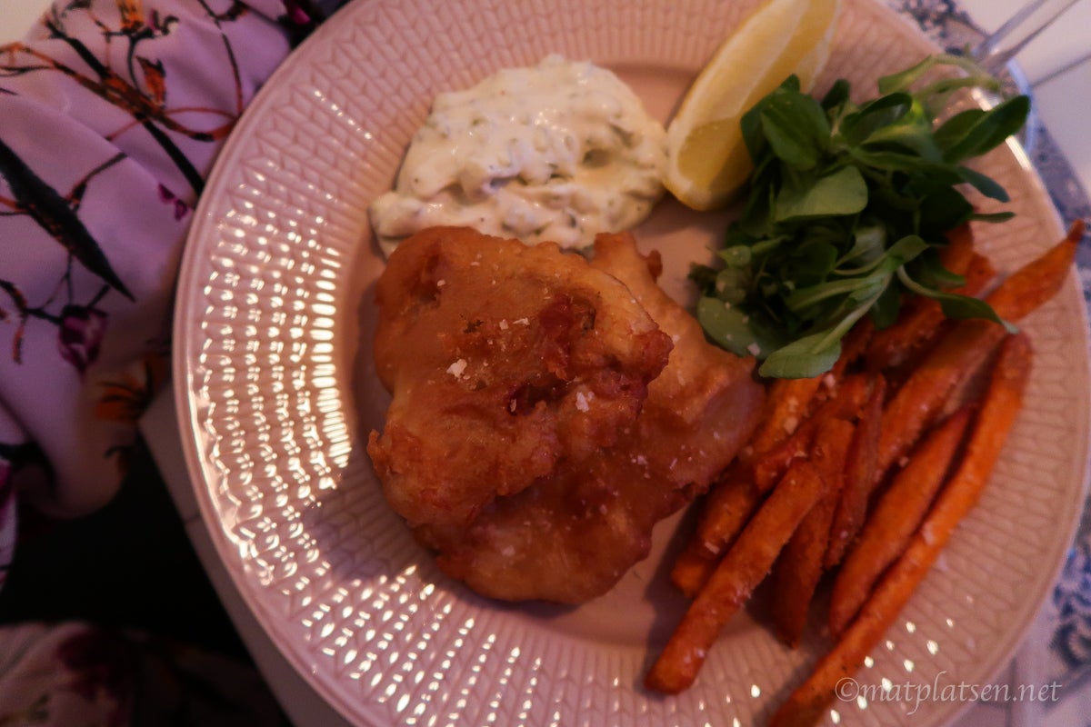 Nu ska ni får receptet på sååååå goda Fish ´n chips. Smakar som på viken proffsig restaurang som helst. Fick detta hemma hos Lottie på en middagsbjudning och receptet är Per Morbergs (men hon gjorde den på kolja – sååå gott). Till det serverades sötpotatispommes och en god remoulad.