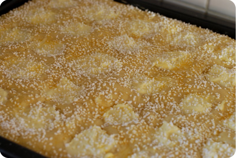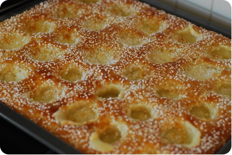 Värm mjölken till 37 C och rör ut jästen med. Tillsätt det rumsvarma smöret, sockret, saltet och nästan allt mjöl. Arbeta degen smidig, gärna i maskin. Använd en ugnplåt täckt med bakplåtpapper. Häll ner degen på plåten och tryck ut den i kanterna (degen blir bra kladdig och lös, men den ska vara så!).Täck med en bakduk och låt jäsa 30 minuter. Rör under tiden ihop ingredienserna till fyllningen.