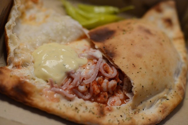 Någon undrade om vi inte äter pizza på söndagar längre och jooooodå det gör vi 🙂 Men jag som försöker hålla nere på kolhydrater äter oftast bara fyllningen faktiskt. Låter knasigt? Är hur gott som helst och jag blir proppmätt. Favoriten just nu är Calzone med räkor i och beasås till. Yummi!